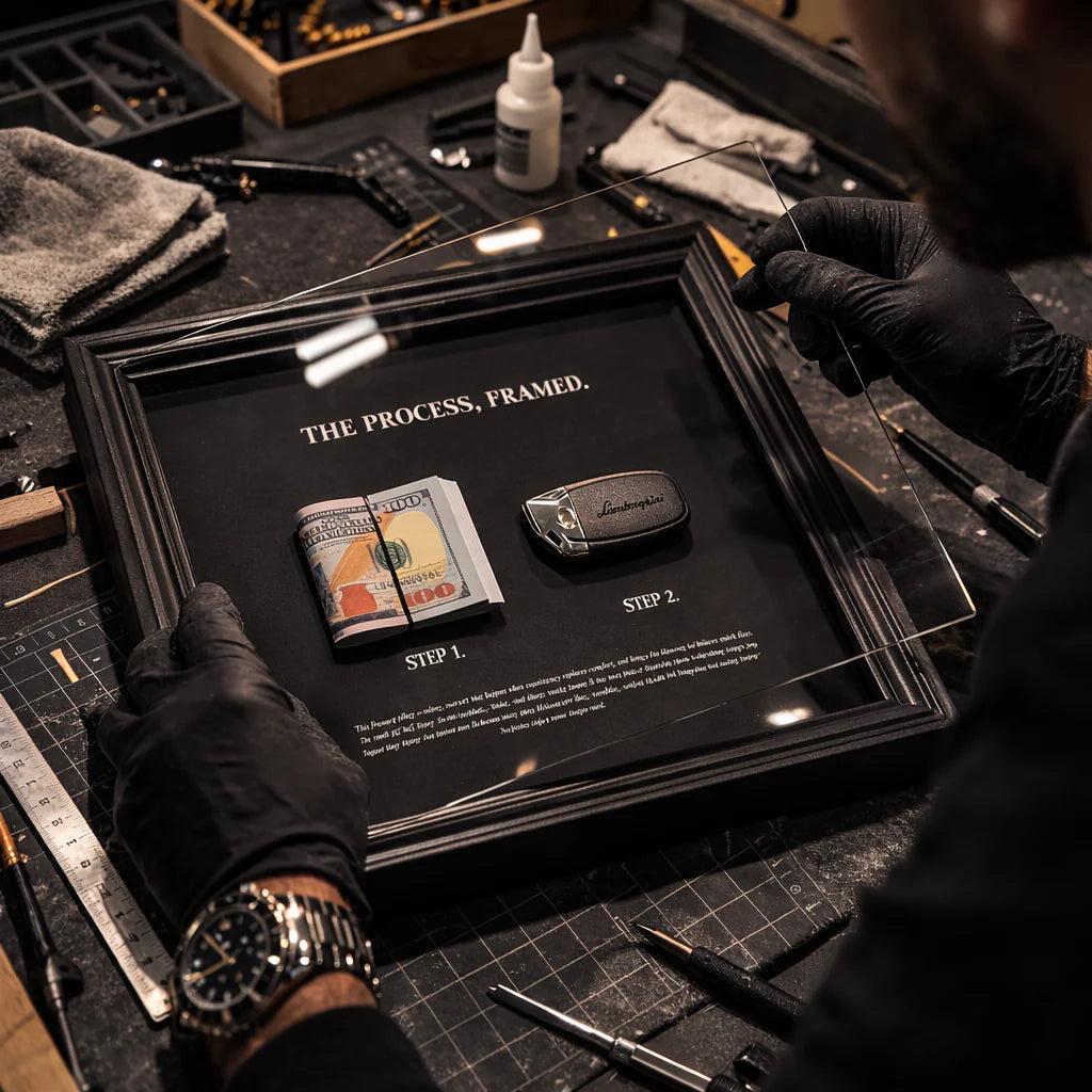 Sur un fond noir mat profond, la pièce centrale met en avant un porte-clés inspiré de Lamborghini — élégant, puissant et immédiatement reconnaissable. Sublimée par l’inscription audacieuse « WORK HARDER. », cette édition est conçue pour capter l’attention et vous rappeler chaque jour ce qu’il faut pour atteindre le sommet. (Taille du cadre : 20 × 25 cm).